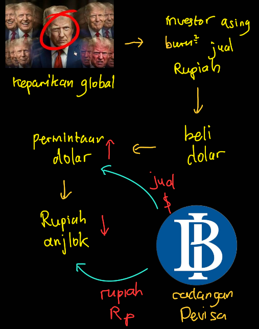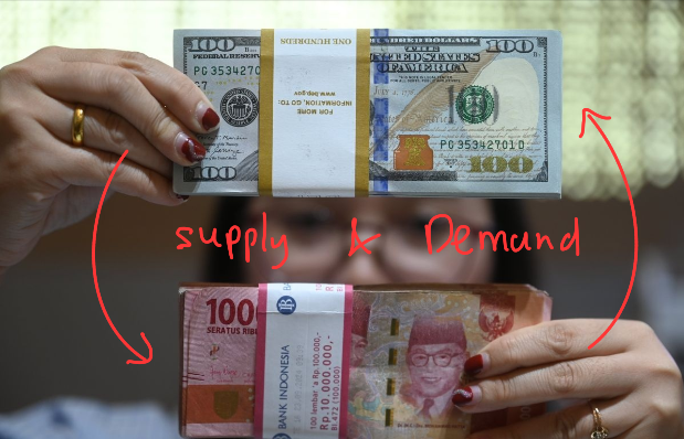 Nilai tukar mata uang itu sangat ditentukan oleh Supply (penawaran) dan Demand (permintaan). Kalau lagi ada kepanikan global, investor asing bakal buru-buru jual aset Rupiah mereka buat beli Dolar AS. Karena banyak yang minta Dolar, akhirnya Rupiah anjlok.