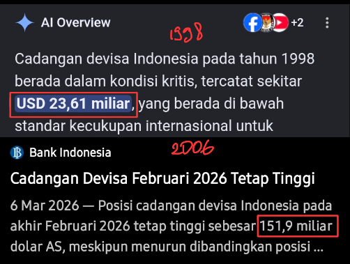 - Tahun 1998: Kondisi kita kritis banget karena cadangan devisa cuma ada sekitar USD 23,61 miliar. Peluru kita habis buat menahan gempuran Dolar.