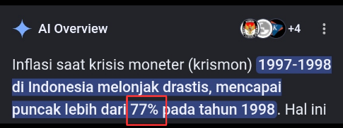 - Tahun 1998: Inflasi meledak sampai lebih dari 77%. Ilustrasinya gini: Dulu uang Rp1.000.000 bisa kamu pakai buat beli 5 karung beras Rojolele. Karena inflasi gila-gilaan, uang sejuta yang sama itu merosot nilainya dan cuma bisa dapet 3 karung beras aja. Daya beli benar-benar hancur.