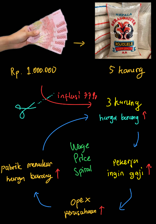 Lingkaran Setan (Wage-Price Spiral): Inflasi 77% itu bikin lingkaran setan. Karena harga barang naik tinggi, pekerja pasti minta gajinya ikut naik. Kalau gaji naik, biaya operasional (Opex) perusahaan jadi bengkak. Biar nggak rugi, pabrik kepaksa menaikkan harga barang lagi. Siklus ini terus aja muter tanpa henti sampai ekonomi hancur. Untungnya, saat ini kita terhindar dari siklus tersebut.