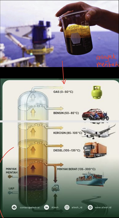 Dari hitungan di atas, kita mendapatkan angka sekitar Rp 11.004/liter. Tapi ingat, ini baru harga minyak mentah. Minyak ini tidak bisa langsung dimasukkan ke tangki motor kamu! Minyak mentah harus diproses uap untuk dipisahkan menjadi gas, bensin, kerosin, diesel, hingga minyak berat.