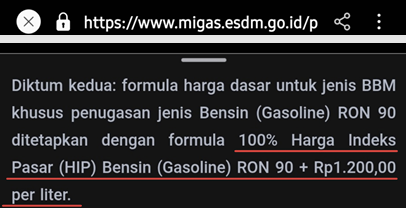 Masalahnya, nilai Harga Indeks Pasar (HIP) ini tidak dipublikasikan ke publik. Jika kita membuat estimasi (berdasarkan data patokan seperti Singapore Mogas 92), hasil perhitungan untuk harga dasar (tanpa subsidi) didapat di angka Rp 15.969 per liter.